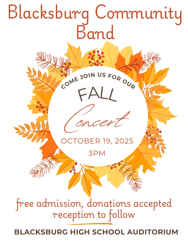 Blacksburg Community Band presents their 2025 Fall Concert on Sunday, October 19, 2025 inside the Blacksburg High School Auditorium.