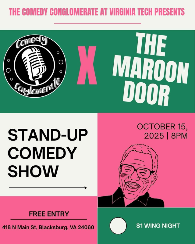 The Comedy Conglomerate at Virginia Tech presents a Comedy Show on Wednesday, October 15, 2025 at The Maroon Door in Blacksburg, VA.