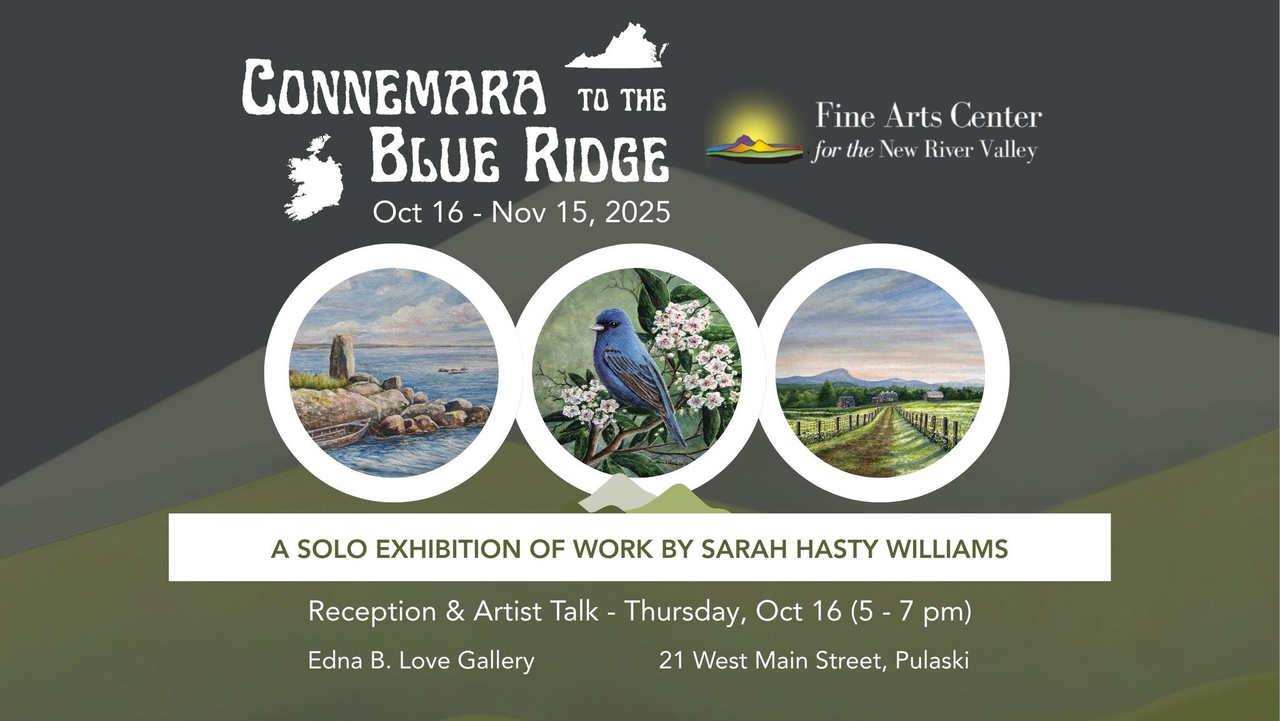 The Fine Arts Center for the New River Valley presents the Opening Reception for Connemara to the Blue Ridge and Artist Talk featuring work by Sarah Hasty Williams on Thursday, October 16, 2025.