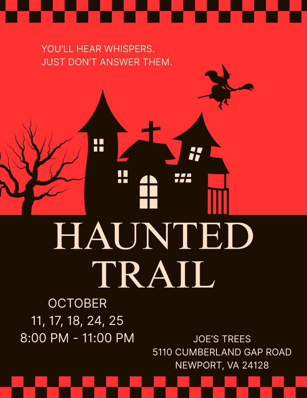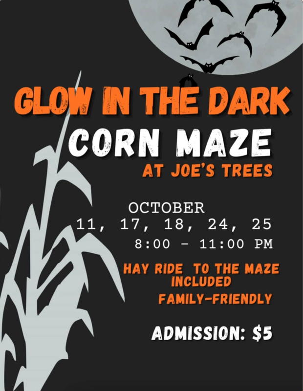 Joe's Trees presents their Haunted Trail and Glow in the Dark Corn Maze on Saturday, October 18, 2025.