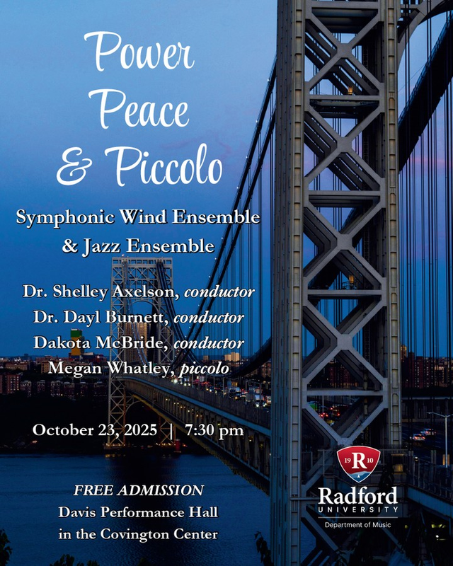 Radford University College of Visual & Performing Arts presents the Radford University Symphonic Wind Ensemble & Jazz Ensemble in concert titled "Power, Peace & Piccolo" on Thursday, October 23, 2025 inside the Covington Center on the campus of Radford University.
