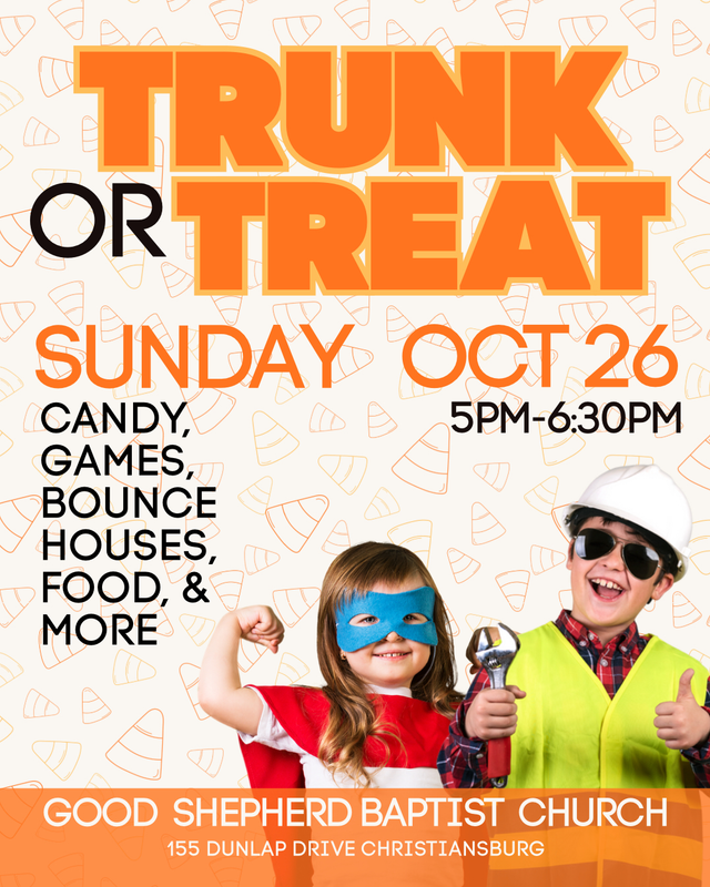 Good Shepherd Baptist Church presents their 2025 Trunk or Treat on Sunday, October 26, 2025.
