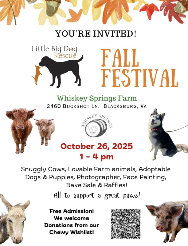 Little Big Dog Rescue presents their 2025 Fall Festival on Sunday, October 26, 2025 at Whiskey Springs Farm in Blacksburg, VA.