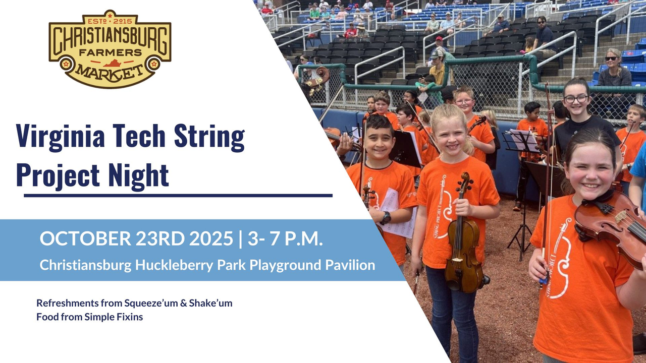 The Christiansburg Farmers Market presents Virginia Tech String Project Night during their Weekly Market on Thursday, October 23, 2025 at Huckleberry Park's Playground Pavilion.