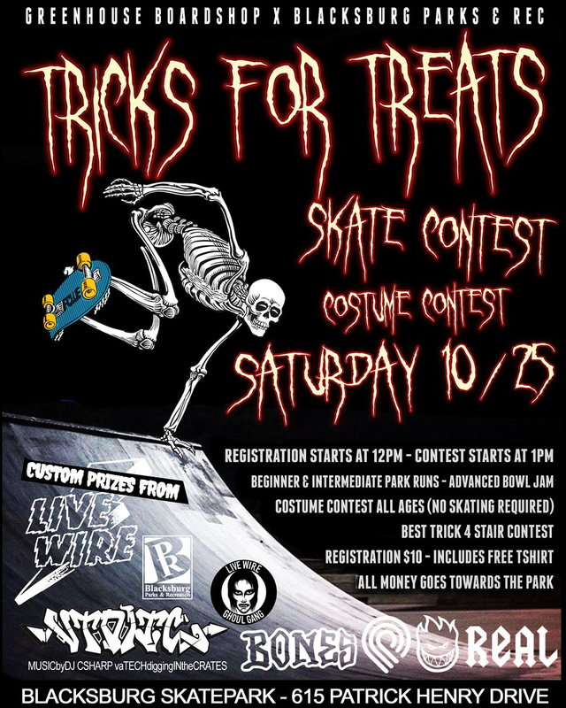 Blacksburg Parks and Recreation Department and Greenhouse Boardshop presents the Trick For Treats Skateboard Contest and Costume Contest on Saturday, October 25, 2025 at the Blacksburg Skate Park.