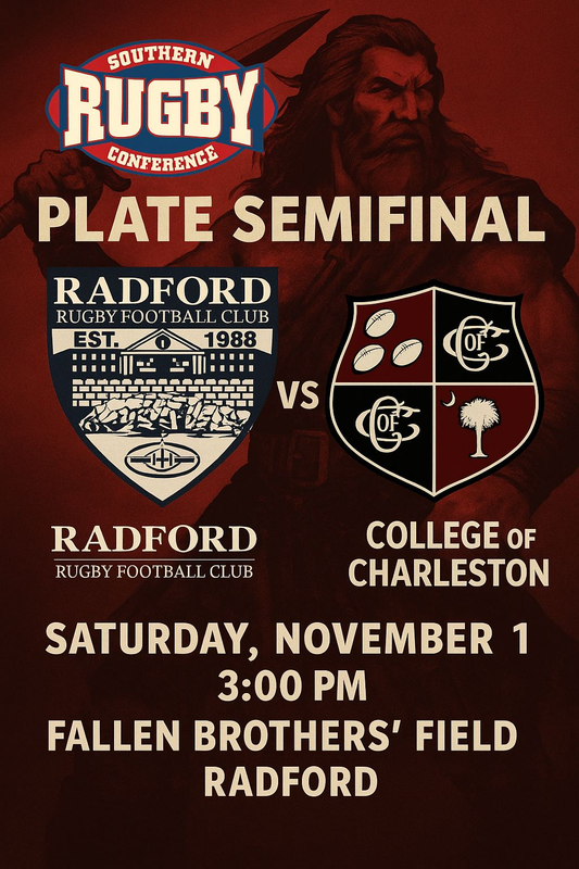 Radford University Men's Rugby Club is hosting the College of Charleston in the semifinal match of the Southern Rugby Conference at Fallen Brothers' Field on the campus of Radford University on Saturday, November 1, 2025.