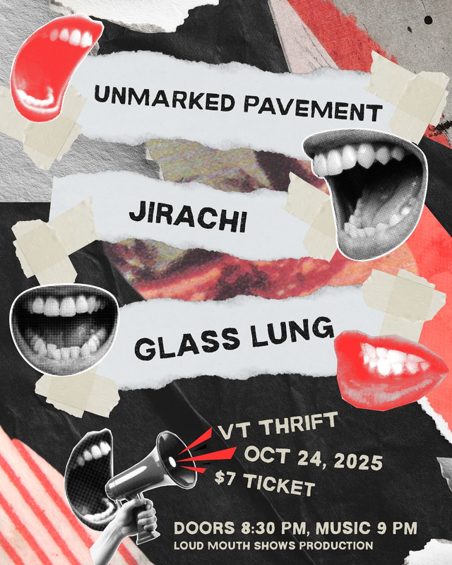 Loud Mouth Shows Production presents their first pop up show featuring a Three Band Concert with Unmarked Pavement, Jirachi and Glass Lung on Friday, October 24, 2025 at VT Thrift in Blacksburg, VA.