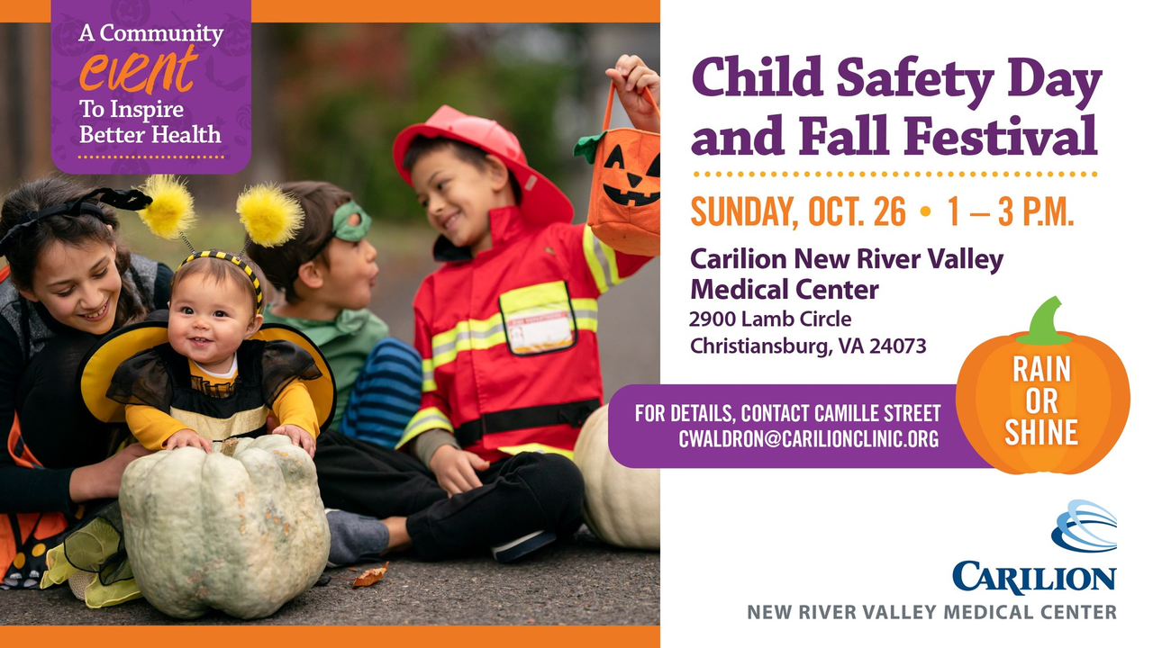 Carilion New River Valley Medical Center presents their 2025 Child Safety Day and Fall Festival for Toddlers, Tweens and Teens on Sunday, October 26, 2025.