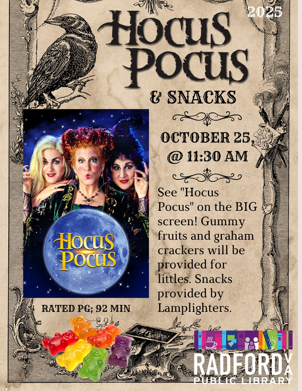 The Radford Public Library presents a screening of "Hocus Pocus" on the big screen with Snacks on Saturday, October 25, 2025.