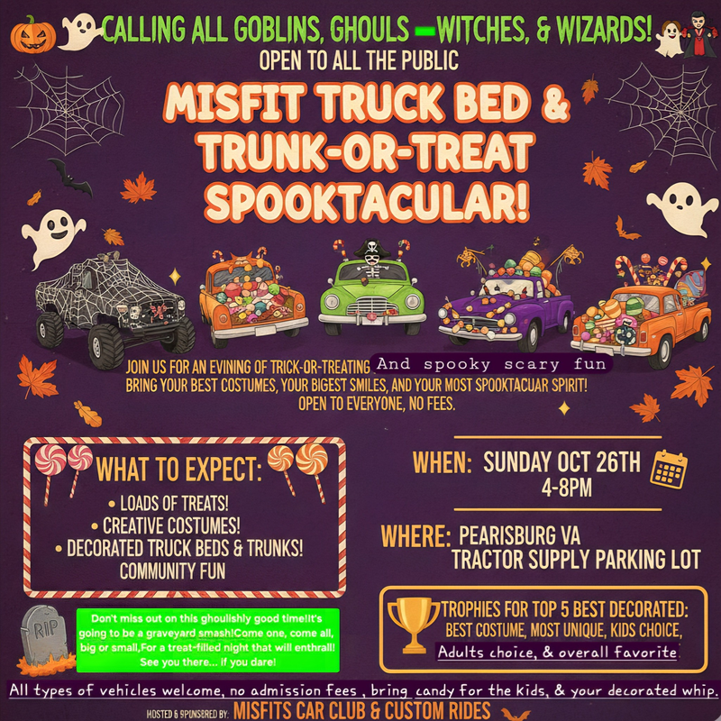 Misfits Car Club & Custom Rides presents the Truck Bed & Trunk-or-Treat Spooktacular on Sunday, October 26, 2025 in the Pearisburg, VA Tractor Supply Co. parking lot.
