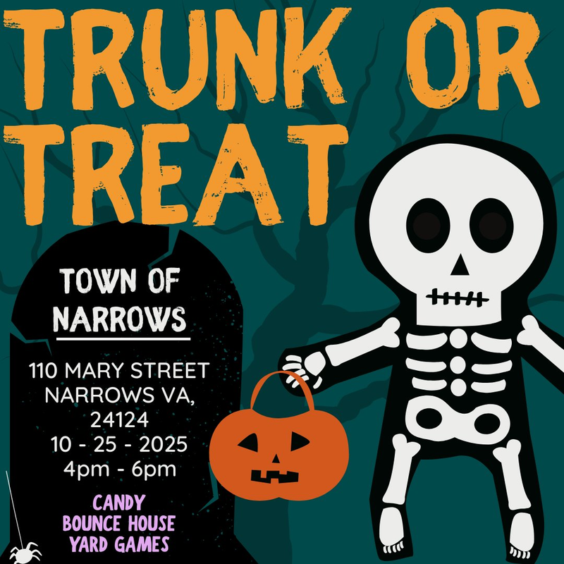 The Town of Narrows presents the Annual Narrows Trunk or Treat on Saturday, October 25, 2025 near the Narrows Community Center in the field next to the Iris Brammer Library.