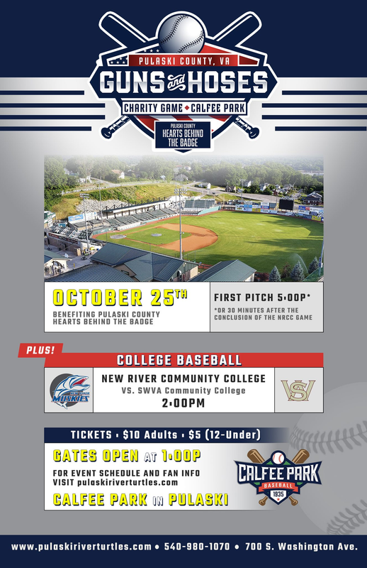 Prior to the Guns and Hoses softball game, New River Community College will host SWVA Community College in a collegiate baseball game starting at 2:00 PM. The Guns and Hoses softball game will start at 5:00 PM or 30 minutes after the conclusion of the baseball game.