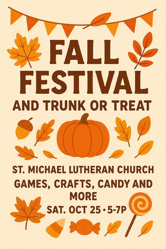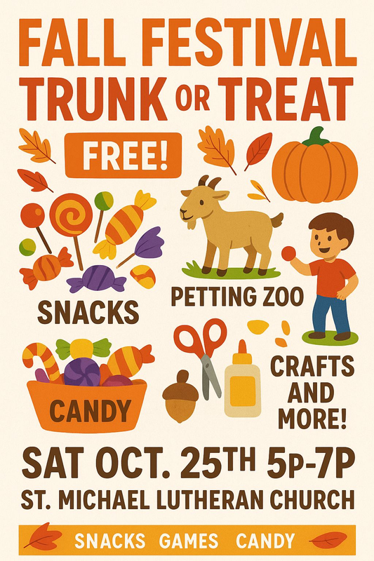 St. Michael Lutheran Church presents their 2025 Fall Festival and Trunk or Treat on Saturday, October 25, 2025.