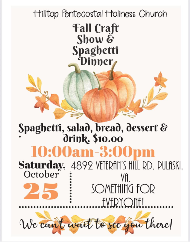 Hilltop Pentecostal Holiness Church presents their Fall Craft Show & Spaghetti Dinner on Saturday, October 25, 2025.