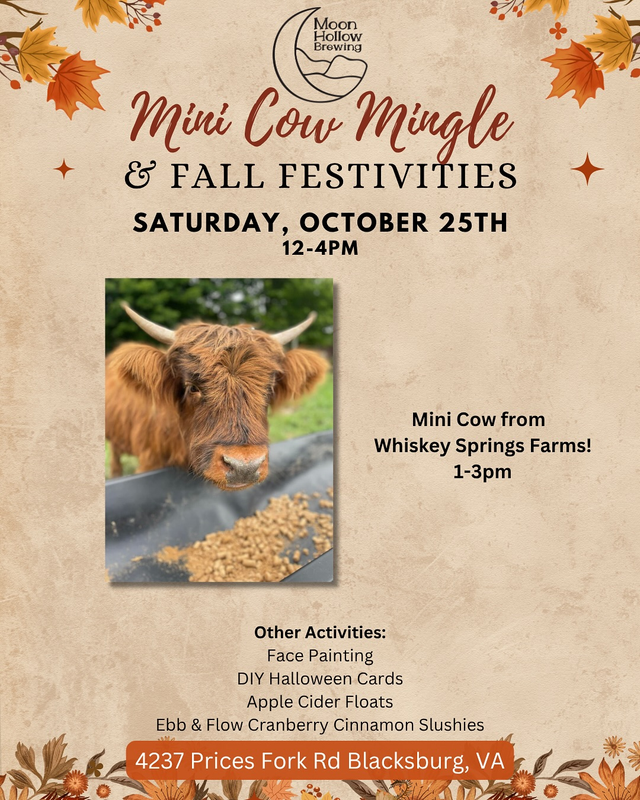 Moon Hollow Brewing presents their 2025 Mini Cow Mingle & Fall Festivities on Saturday, October 25, 2025.