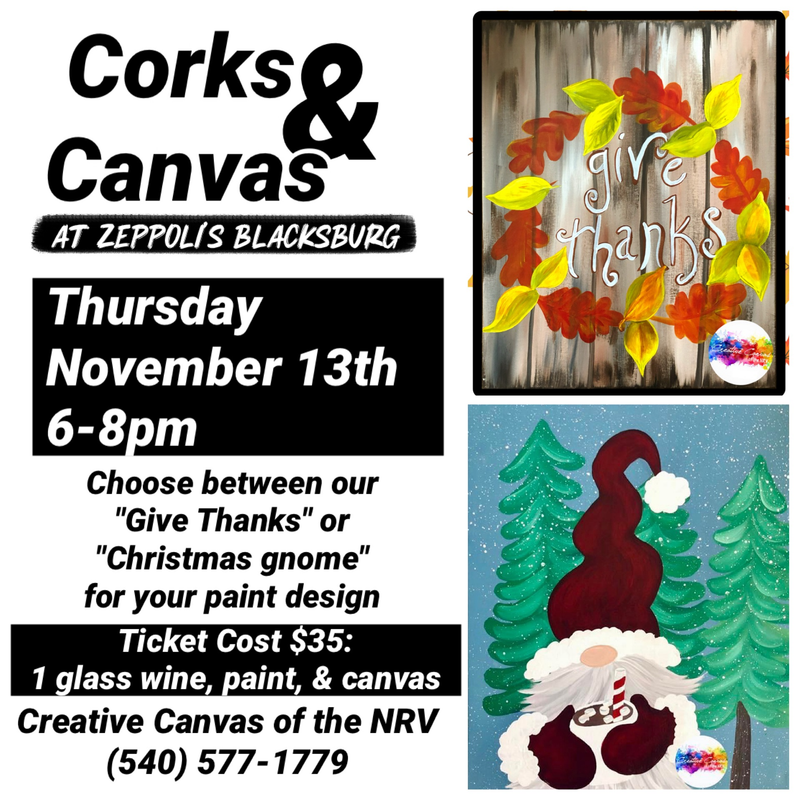 Zeppoli's and Creative Canvas of the NRV presents Corks and Canvas, a Paint and Sip Event on Thursday, November 13, 2025.