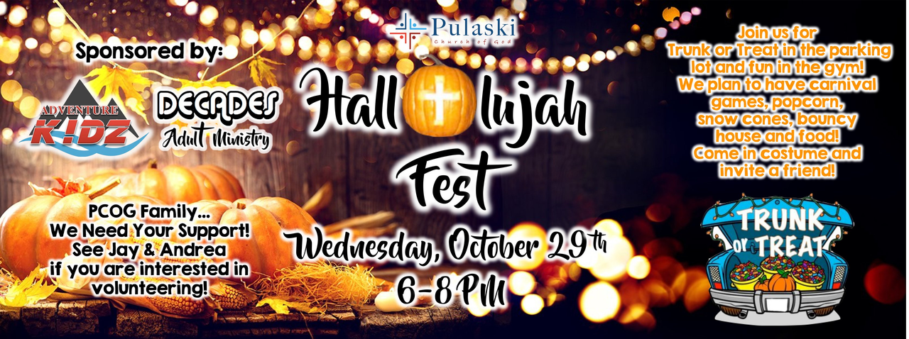 The Pulaski Church of God Decades Adult Ministry and Adventure Kidz presents their Hallo-lujah Fest 2025 on Wednesday, October 29, 2025 in the Pulaski Church of God Fellowship Hall.