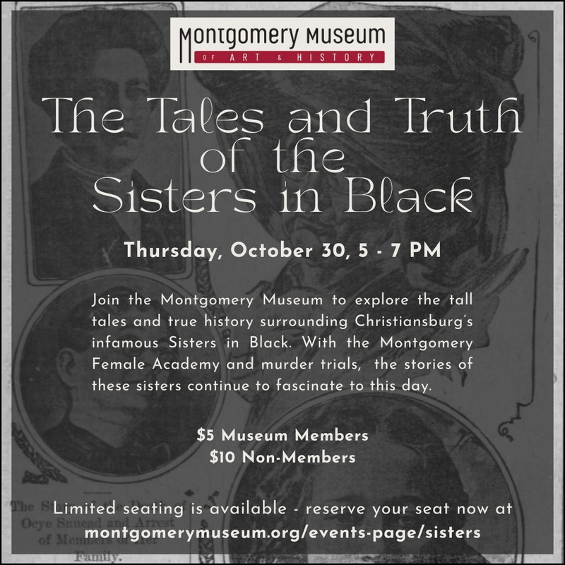 Join the Montgomery Museum to explore the tall tales and true history surrounding Christiansburg’s infamous Sisters in Black. With the Montgomery Female Academy and murder trials, the stories of these sisters continue to fascinate to this day. They've become a subject surrounded by mystery and alleged hauntings, but we'll be examining the true history behind the Sisters in Black and their time in Christiansburg.
