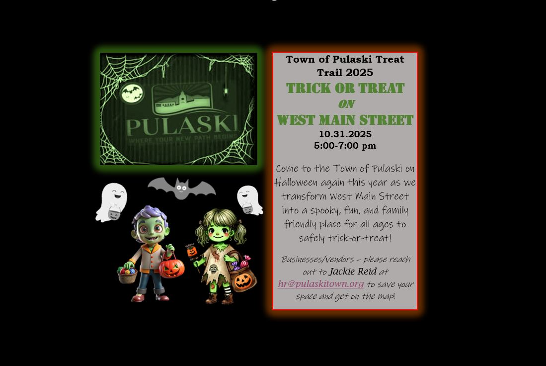 The Town of Pulaski, VA presents the 2025 Town of Pulaski Treat Trail on West Main Street in Downtown Pulaski, VA on Friday, October 31, 2025 starting at the intersection of Jefferson Street and Main Street.