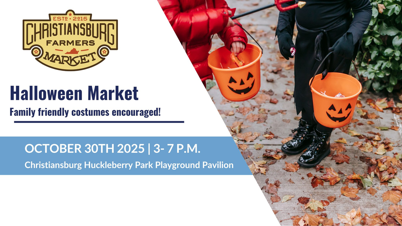 The Christiansburg Farmers Market presents their Halloween Market and Last Weekly Market of 2025 on Thursday, October 30, 2025 at Huckleberry Park's Playground Pavilion.