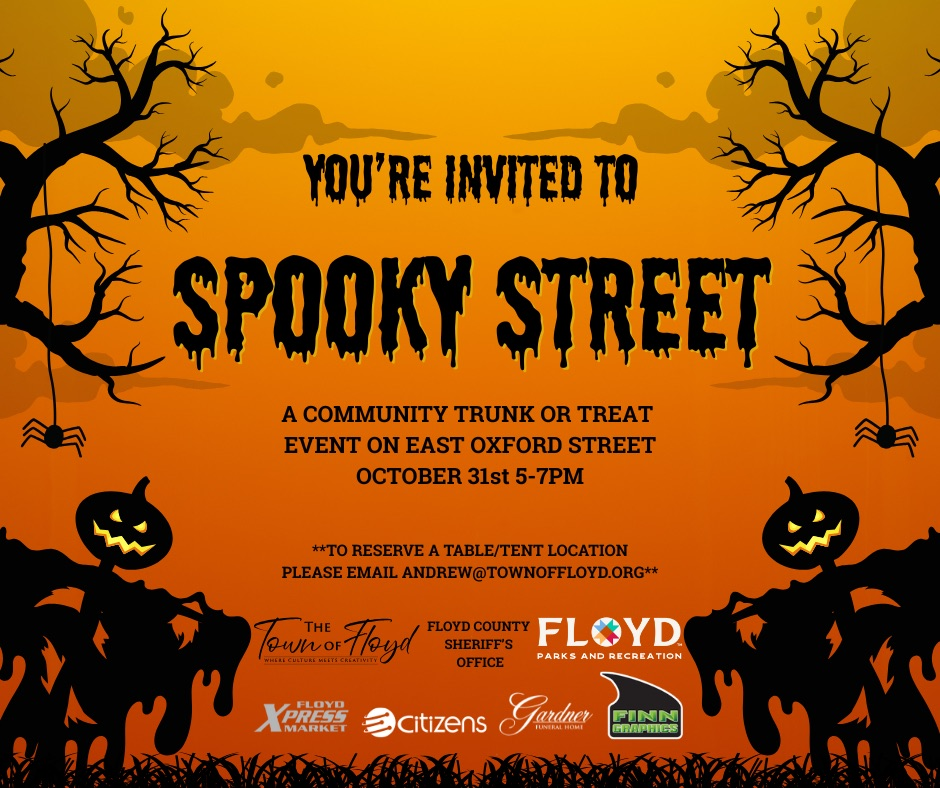 The Town of Floyd, Floyd's Parks & Recreation and Citizens presents the Annual Spooky Street Community Trick or Treat on Friday, October 31, 2025 on East Oxford Street in downtown Floyd, Virginia.