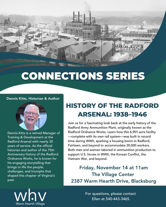 Warm Hearth Village presents the talk "History of the Radford Arsenal: 1938-1946" on Friday, November 14, 2025 at Warm Hearth Village Center in Blacksburg, VA.