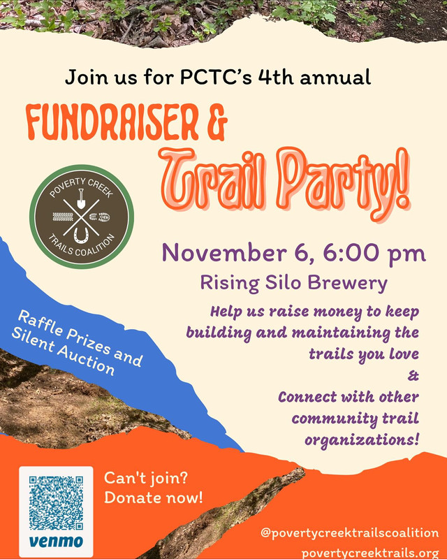 The Poverty Creek Trails Coalition (PCTC) presents their 4th Annual Fall Fundraiser and Trail Party on Thursday, November 6, 2025 at Rising Silo Farm Brewery.