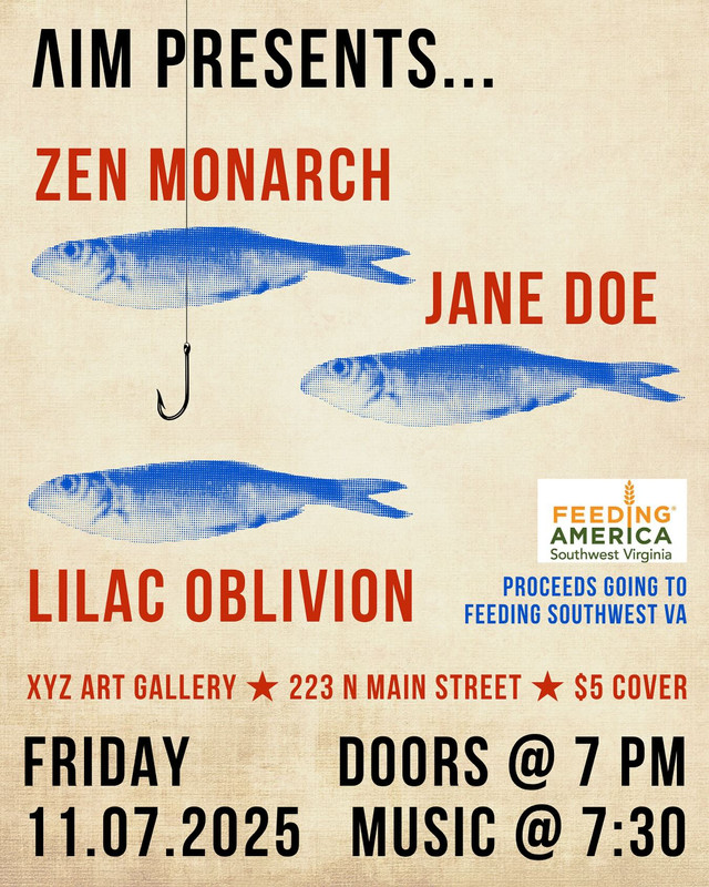 Lamba Iota Mu Fraternity at Virginia Tech presents a Three Band Concert Fundraiser with Zen Monarch, Jane Doe and Lilac Oblivion on Friday, November 7, 2025 at the XYZ Art Gallery in downtown Blacksburg, VA.