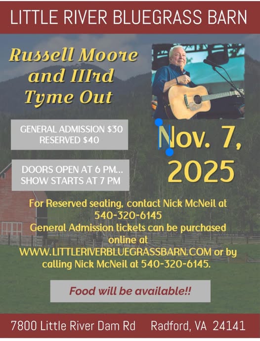 https://littleriverbluegrassbarn.com/event/russell-moore-and-iiird-tyme-out/ or