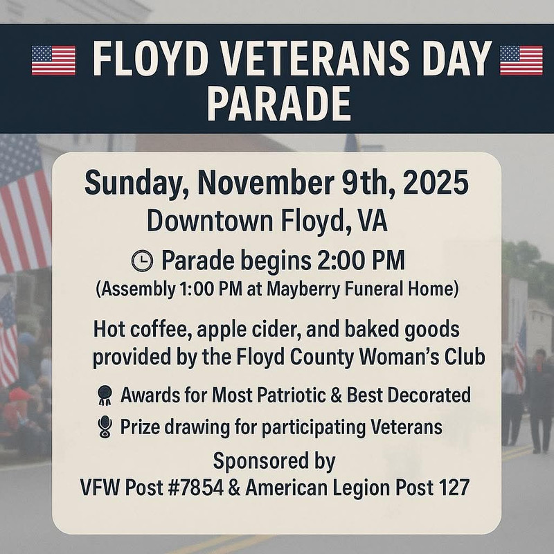 The Floyd County Veterans of Foreign Wars Post #7854 and American Legion Post 127 presents the 2025 Floyd Veterans Day Parade in downtown Floyd, VA on Sunday, November 9, 2025.