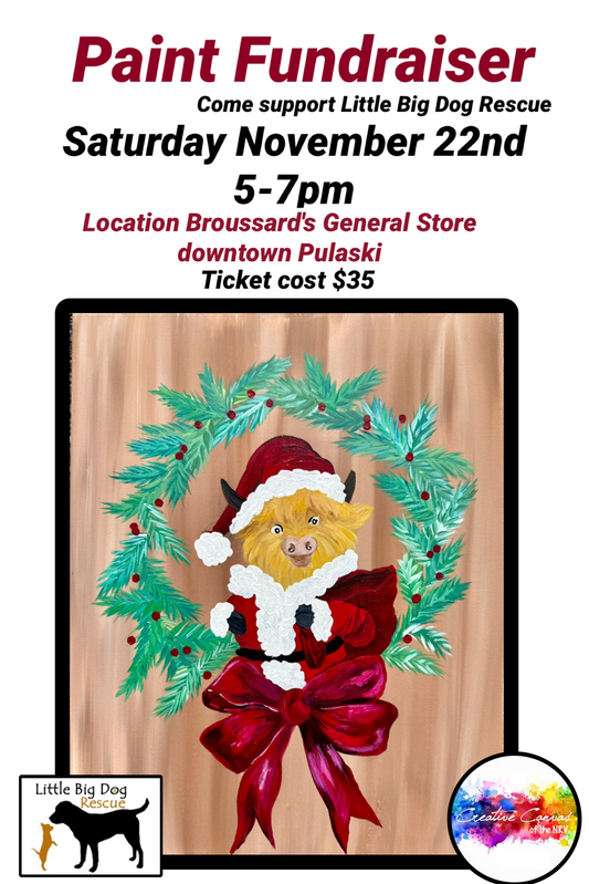 Creative Canvas presents a Paint Night Fundraiser for Little Big Dog Rescue on Saturday, November 22, 2025 at Broussard's General Store in Pulaski, VA.