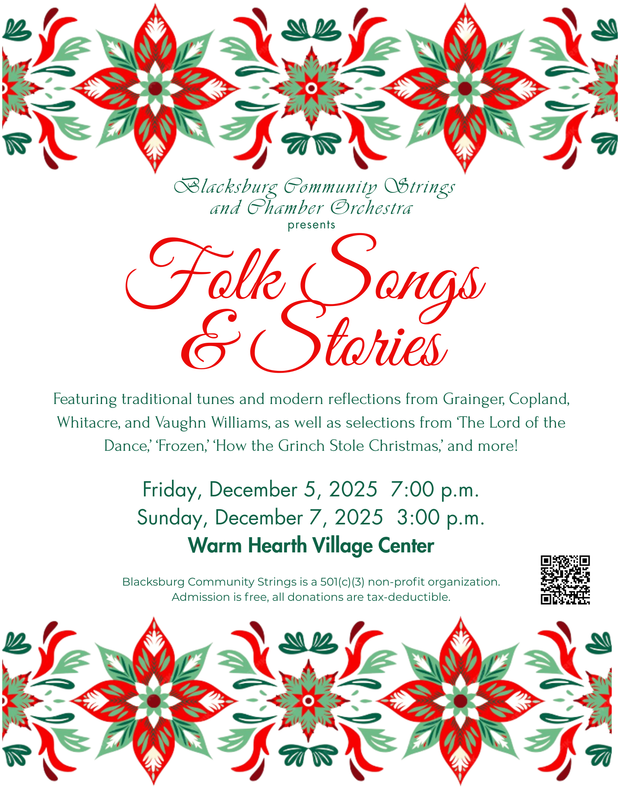 Blacksburg Community Strings and Chamber Orchestra presents their Fall Concert titled "Folk Songs & Stories" with two performances on Friday, December 5, 2025 and Sunday, December 7, 2025 at Warm Hearth Village Center.
