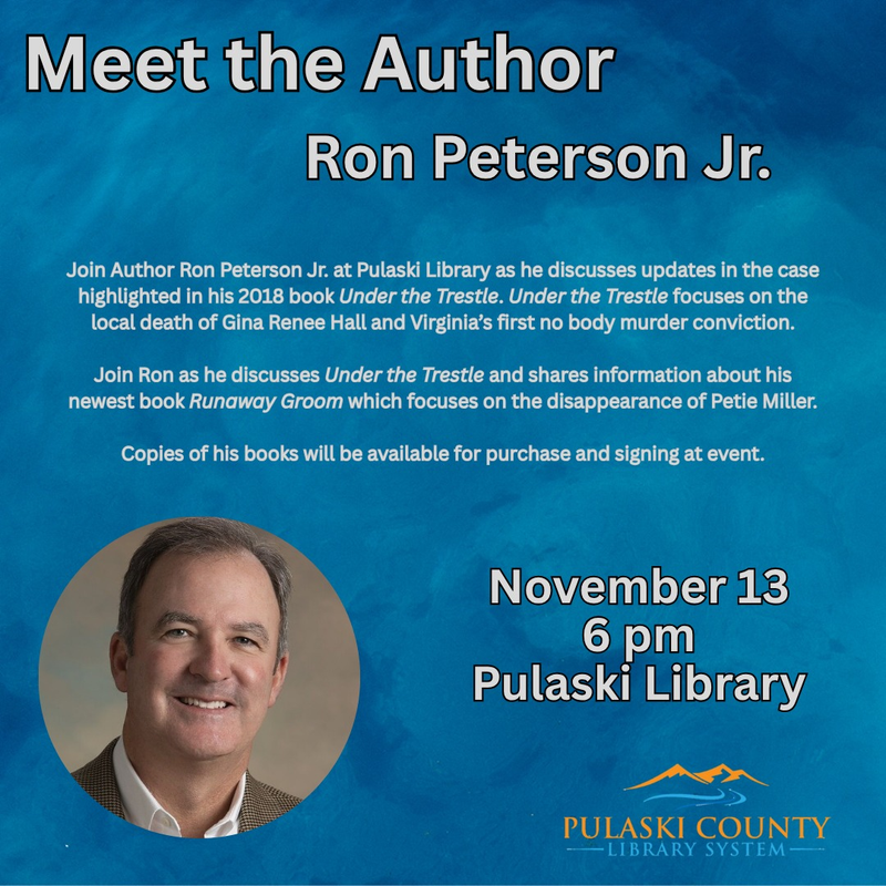 Join Author Ron Peterson Jr. at Pulaski Library as he discusses updates in the case highlighted in his 2018 book "Under the Trestle". "Under the Trestle" focuses on the local death of Gina Renee Hall and Virginia’s first no body murder conviction.