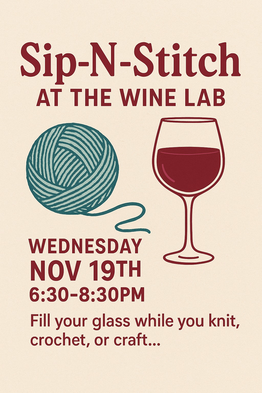 Bring your latest project (or start something new) and join fellow stitchers for a cozy evening of creativity and conversation. Fill your glass while you knit, crochet, or craft because everything’s better with good company and a great pour.