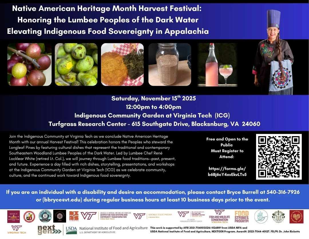The Indigenous Community at Virginia Tech presents the Native American Heritage Month Harvest Festival: Honoring the Lumbee People of the Dark Water – Elevating Indigenous Food Sovereignty in Appalachia on Saturday, November 15, 2025 at the Indigenous Community Garden at Virginia Tech located at the Virginia Tech Turfgrass Research Center.