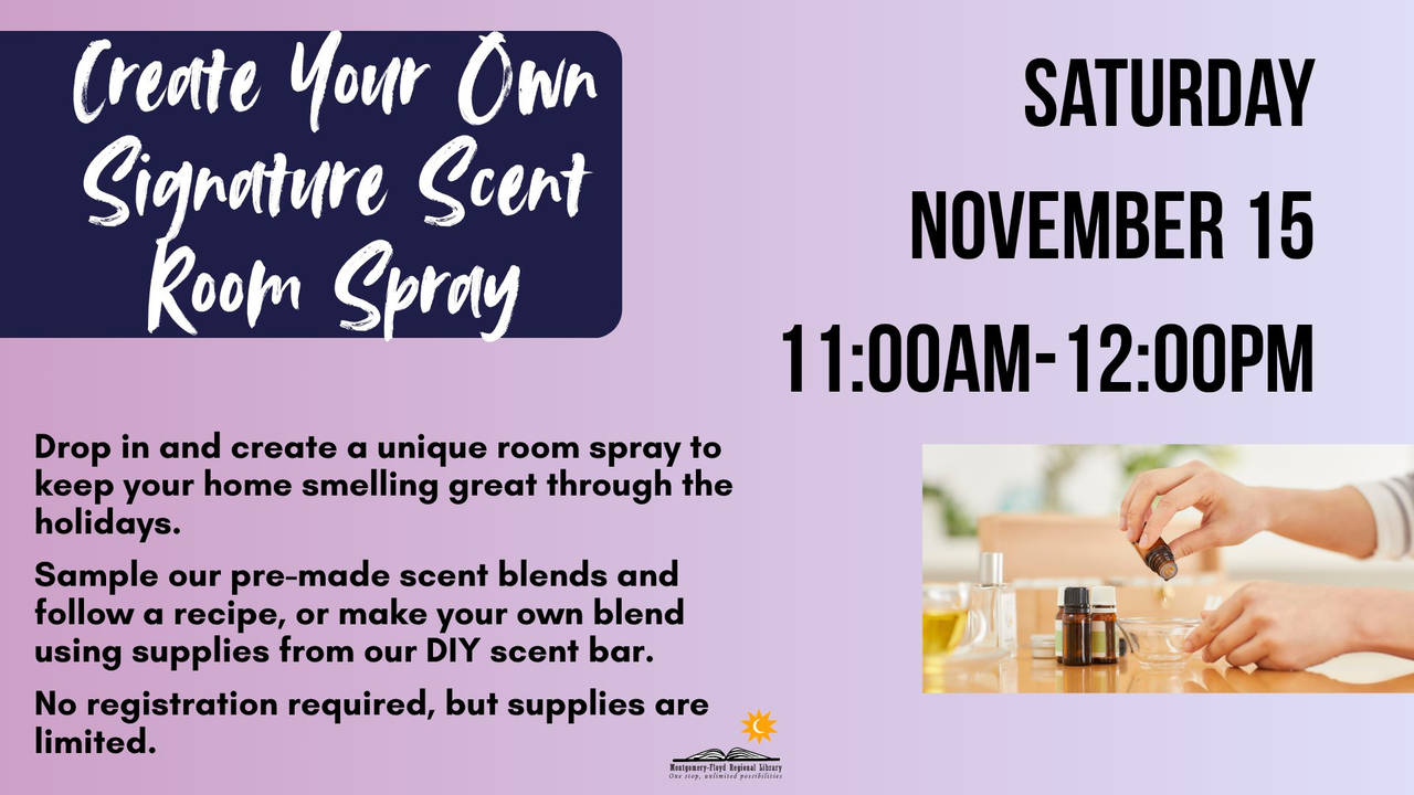 Meadowbrook Public Library presents Create Your Own Signature Scent Room Spray on Saturday, November 15, 2025.