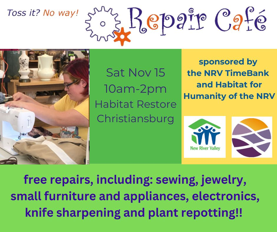 The New River Valley Timebank and the Habitat for Humanity ReStore presents the 2025 Fall Repair Cafe on Saturday, November 15, 2025.