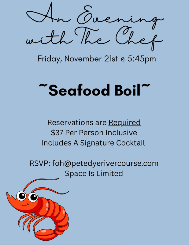 The Pete Dye River Course presents "Evening with The Chef: Seafood Boil" on Friday, November 21, 2025.