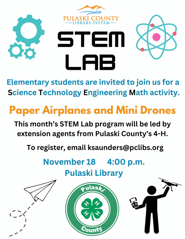 The Pulaski County Library presents a monthly STEM Lab with the theme Paper Airplanes and Mini Drones on Tuesday, November 18, 2025.