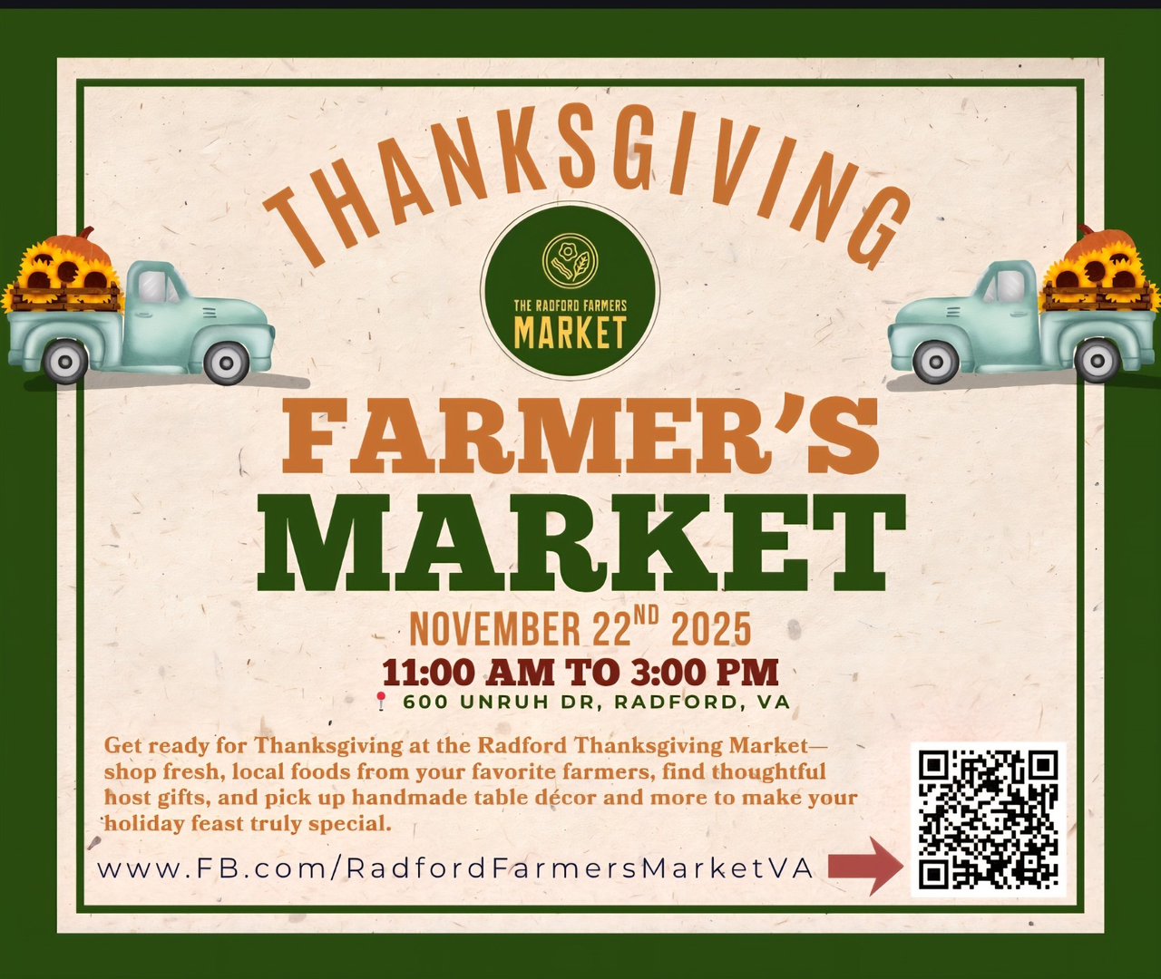 The Radford Farmers Market presents the Pre-Thanksgiving Pop-Up Market on Saturday, November 22, 2025 in the parking lot of Glencoe Mansion, Museum & Gallery in Radford, VA.