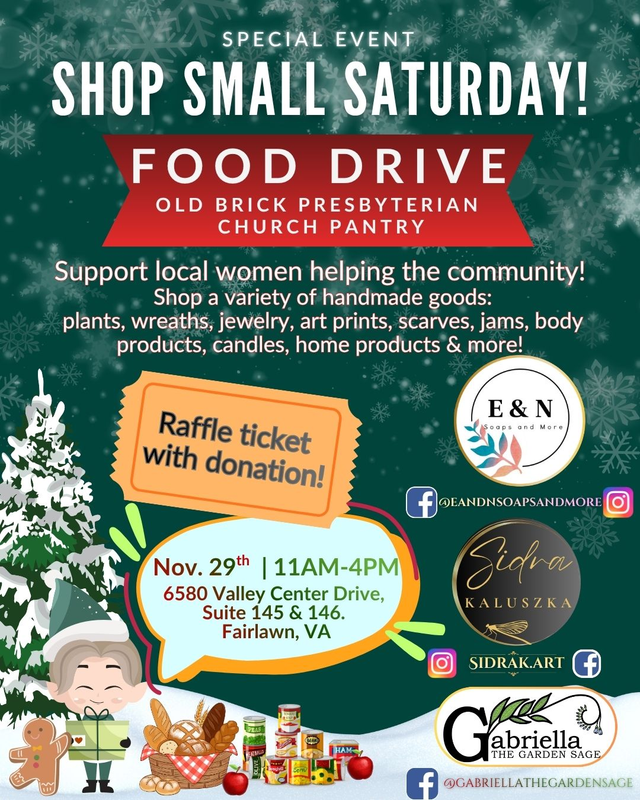 We are also taking donations for the Old Brick Presbyterian Church Pantry in Radford. All donations get you a raffle ticket for a chance to win hand-made goodies.