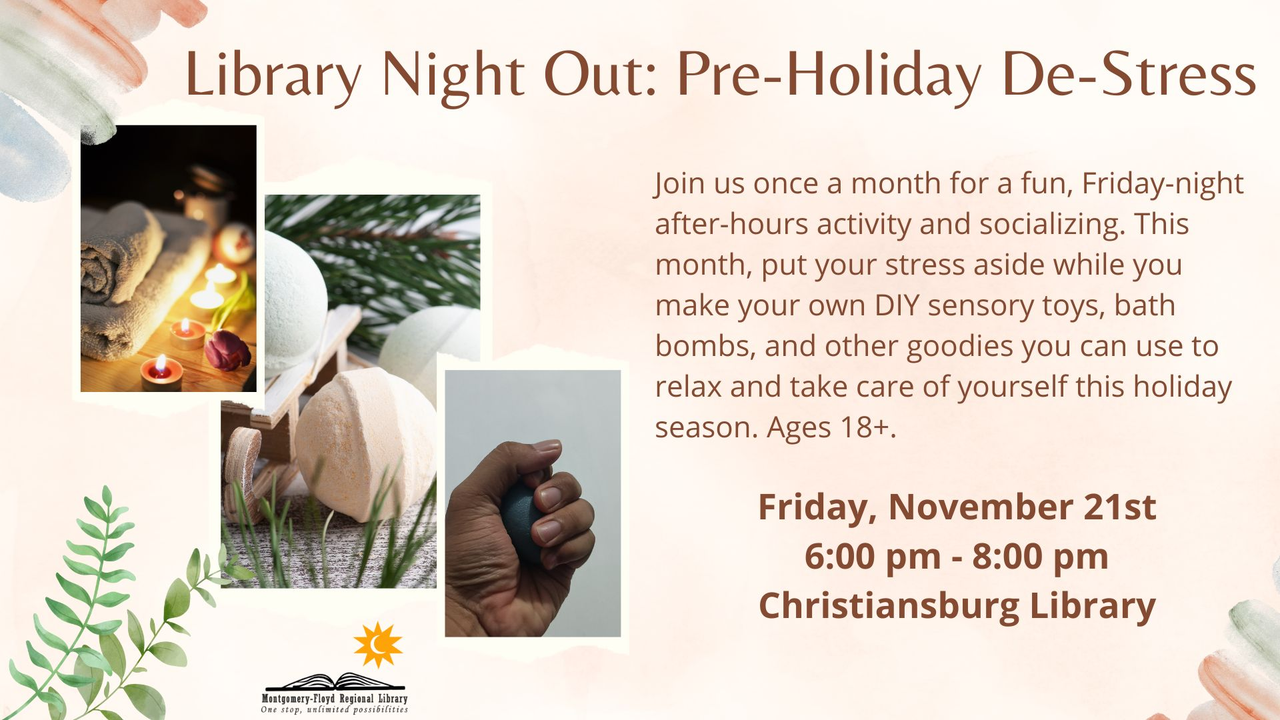 The Christiansburg Library continues their Library Night Out series titled "Pre-Holiday De-Stress" for adults on Friday, November 21, 2025.