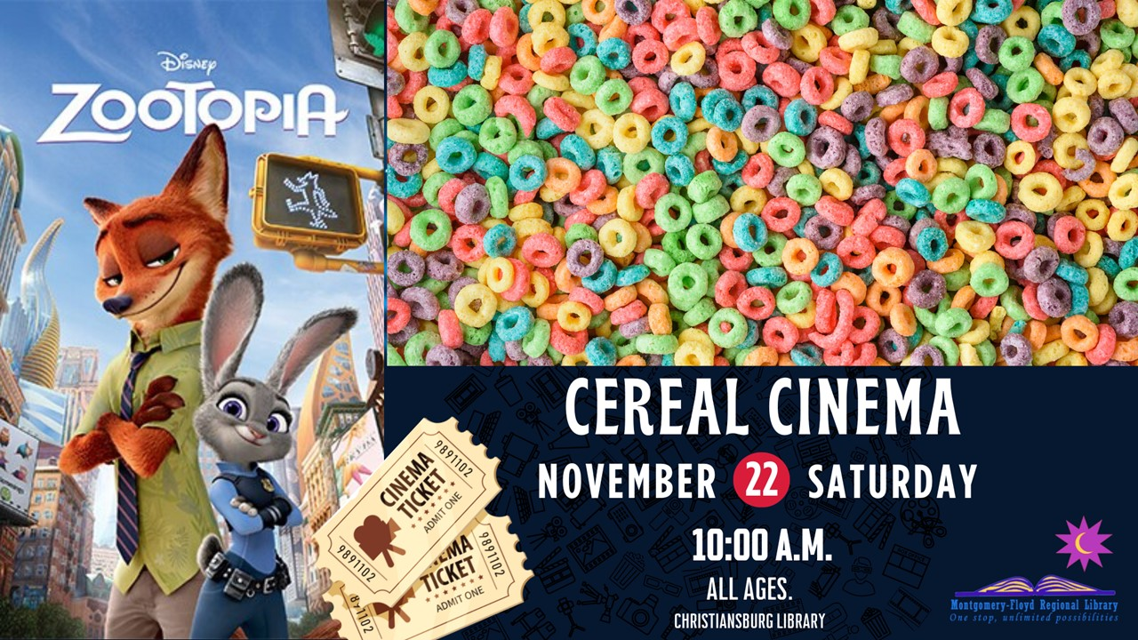 The Christiansburg Library continues their Cereal Cinema series featuring "Zootopia" on Saturday, November 22, 2025.