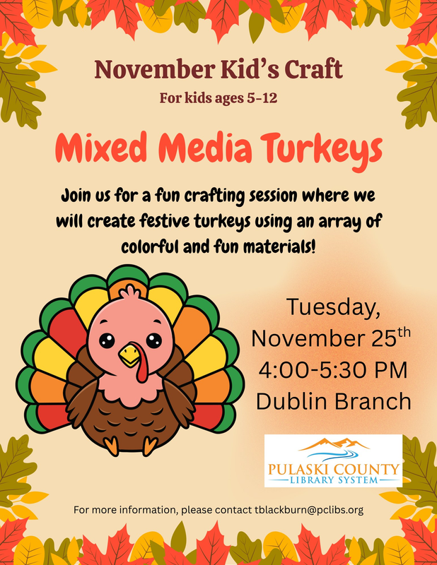 The Charles & Ona B Free Memorial Library (Dublin Library) presents their November Kid's Craft titled "Mixed Media Turkeys" on Tuesday, November 25, 2025.