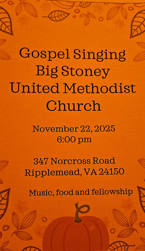Big Stoney United Methodist Church presents their Annual Gospel Singing on Saturday, November 22, 2025.
