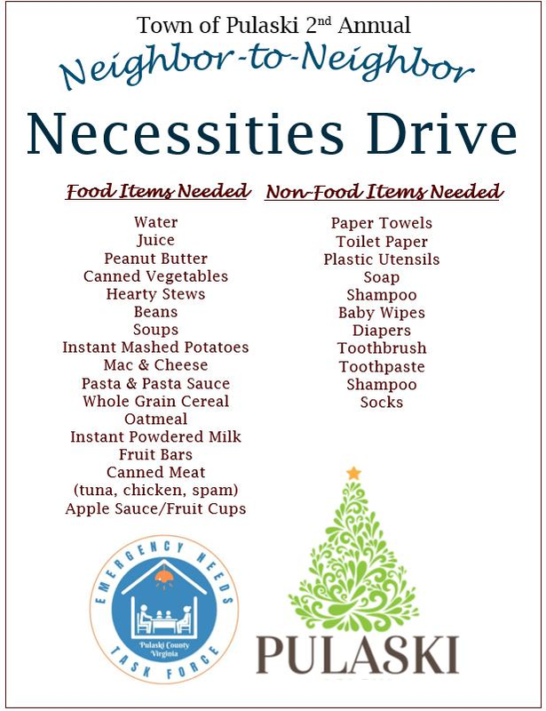 The Pulaski County Jaycees, in partnership with employees of the Town of Pulaski are pleased to announce that items will be collected during the Town of Pulaski Christmas Parade to support the Emergency Needs Task Force of Pulaski County’s Necessities Drive.