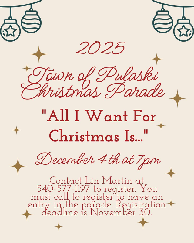 The Town of Pulaski and the Pulaski County Jaycees present the 2025 Christmas Parade on Thursday, December 4, 2025 in downtown Pulaski, VA.