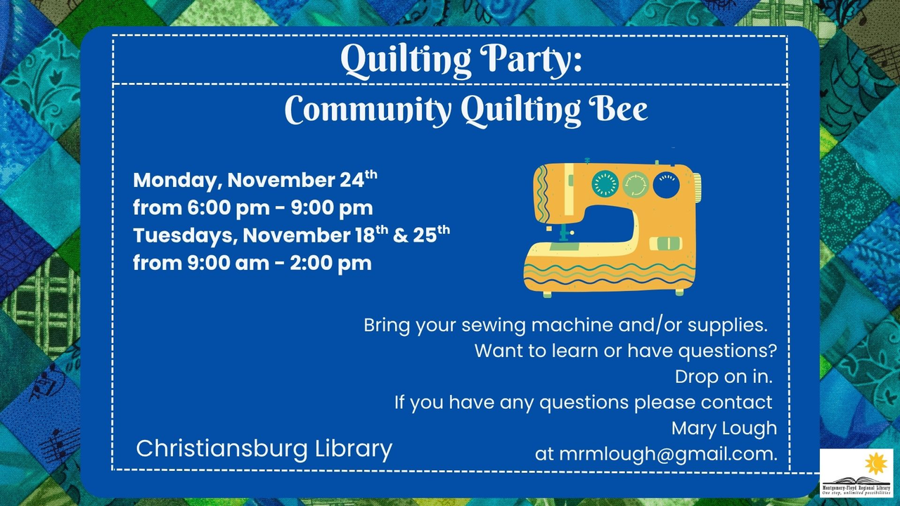 The Christiansburg Library and the Quilting Party presents a Community Quilting Bee on Monday, November 24, 2025.