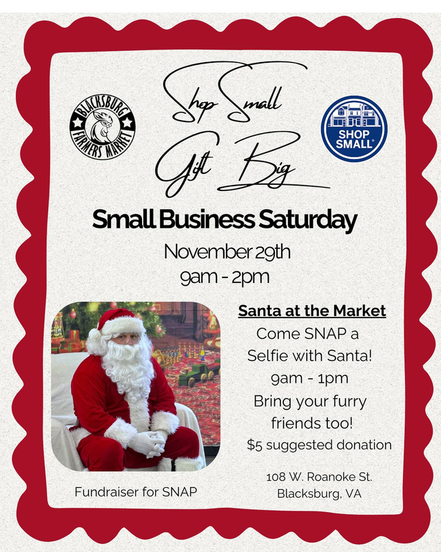 The Blacksburg Farmers Market presents their regular farmers market with Santa at the Market on Saturday, November 29, 2025 at Market Square Park.