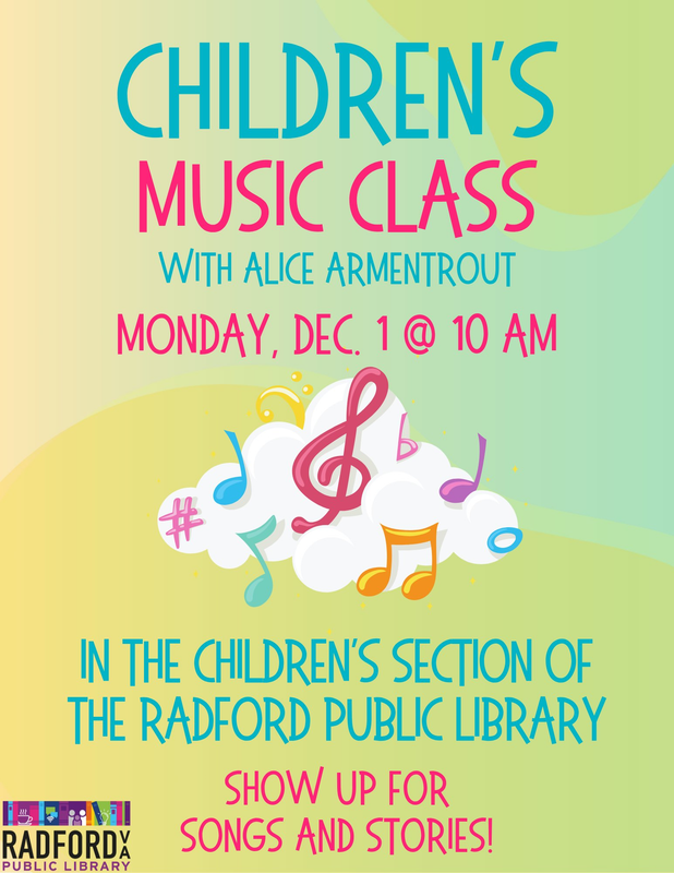 The Radford Public Library presents their December Children's Music Class on Monday, December 1, 2025.